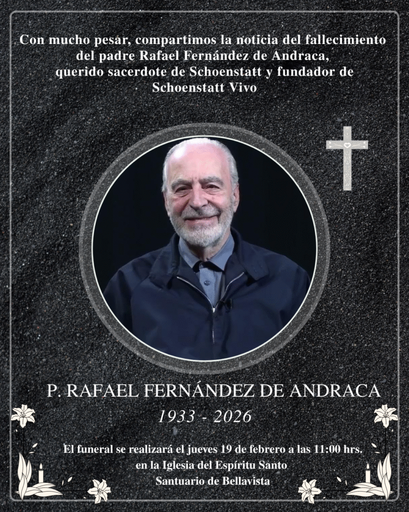 Nuestras sentidas condolencias por la partida al Schoenstatt eterno del Padre Rafael Fernandez. Hemos aprendido mucho de él, y a través de él, de la vida y carisma del Padre José Kentenich, de como ser un mejor dirigente para las Familias. Sus enseñanzas han contribuido invaluablemente para el fortalecimiento de la comunidad Shoenstattiana en Latinoamérica principalmente. Seguro estará junto a Dios Padre y al Padre JK gozando del descanso eterno.